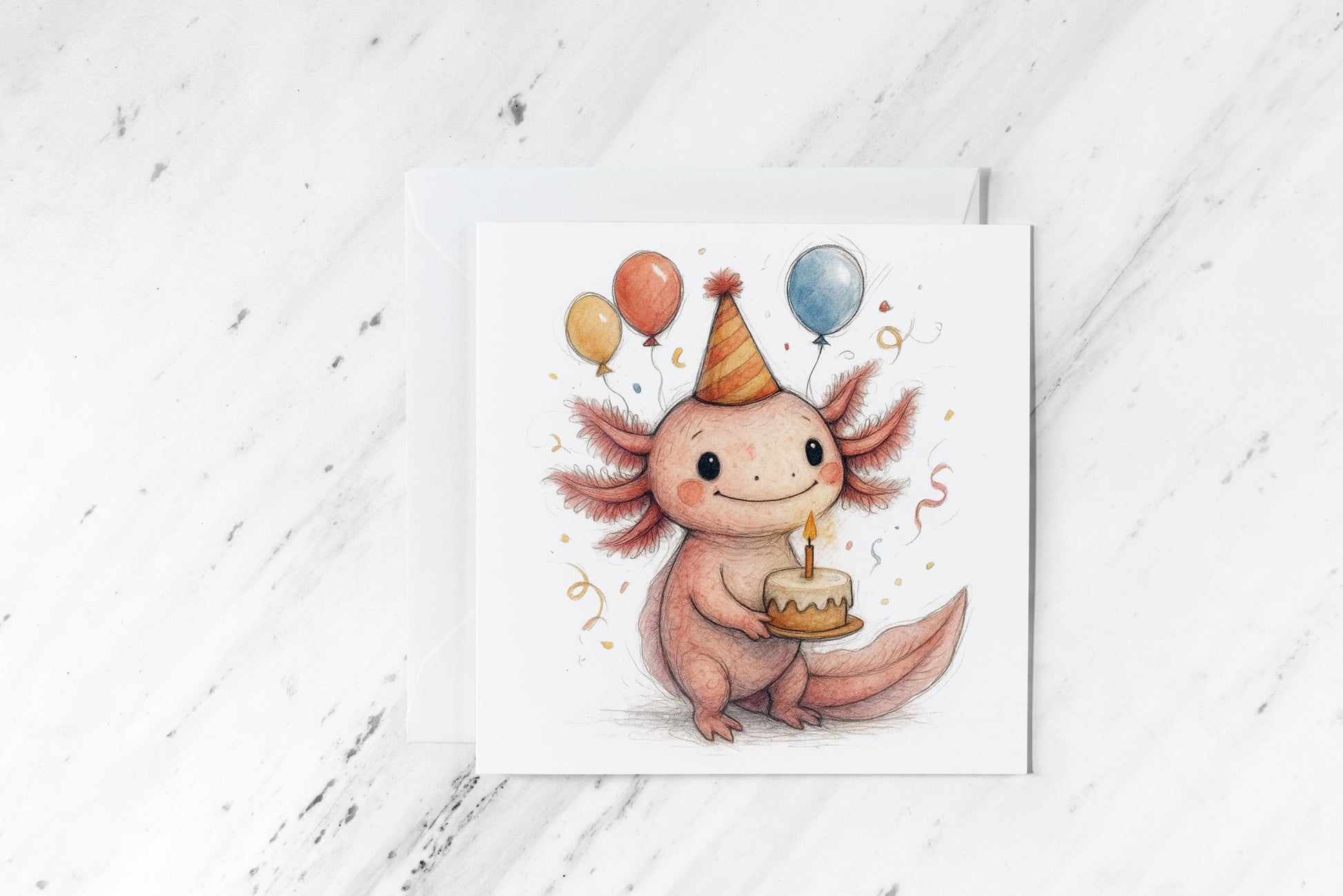 Birthday Axolotl Card โ Cute Watercolour Amphibian with Cake and Balloons โ Fun Handmade Animal Greeting โ Quirky Party Illustration Let the birthday party get weird (in the best way) ๐๐ฆ This delightfully quirky card features an axolotl with a big birthday grin, holding a little cake with a candle while surrounded by colorful balloons, confetti, and a classic party hat. Hand-painted in watercolour and pencil sketch style, this cheerful design brings the celebration to life โ axolotl-style. Perfect for quirky friends, amphibian fans, or anyone who loves a unique twist on birthday cards. It's fun, heartfelt, and bound to become a favorite keepsake. Blank inside and printed on premium matte cardstock, this card is ready for your personal birthday message โ sweet, silly, or both. ๐จ Printed from original hand-painted watercolour and pencil art โ weirdly cute and joyfully detailed ๐ Includes white envelope โ party-ready and easy to gift ๐ Square 6x6 inch format โ great for birthdays or framing ๐จ๏ธ Printed on thick 300 GSM matte card stock โป๏ธ Packaged plastic-free in a recyclable board-backed envelope โจ Blank inside โ ideal for personalised messages ๐ฎ Quickly shipped with care via Royal Mail ๐๏ธ Designed, printed, and hand-packed at The Occult Print Shop Because nothing says โHappy Birthdayโ like an axolotl with cake.