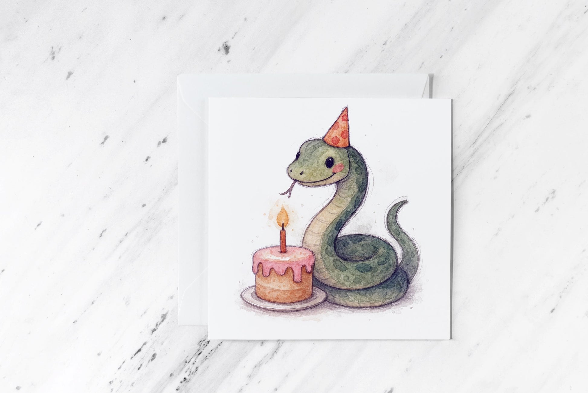 Slither into someone’s birthday with style using this quirky Birthday Snake card! Featuring a coiled serpent in a party hat offering up a birthday cake with a sly smile, this fun design is painted in a charming watercolour and pencil sketch style. Perfect for reptile lovers, snake owners, or anyone who appreciates a tongue-in-cheek twist on birthday greetings. 🐍 6x6 inch square format – includes white envelope 🎨 Printed on 300 GSM premium matte card stock ♻️ Recyclable, plastic-free eco packaging 💬 Blank inside – ready for your hiss-terical message 🖐️ Handmade in the UK by The Occult Print Shop A card that proves even cold-blooded creatures know how to party.