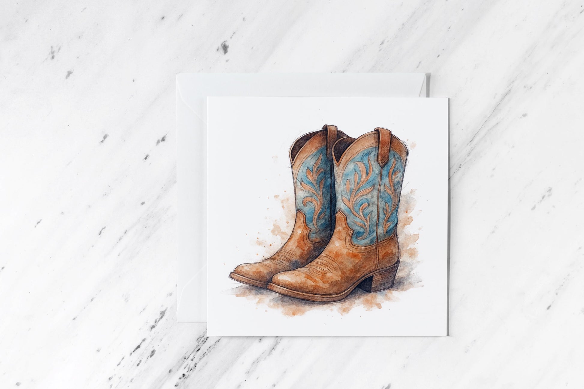 Country Western Cowboy Boots Card – Watercolour Greetings Card – Southern Charm Stationery – Handmade Square Card for Any Occasion Step into celebration with this beautifully rustic cowboy boots card 🤠 Featuring a hand-painted watercolour and pencil sketch of vintage western boots in warm tan leather with detailed blue stitching, this design is the perfect nod to southern style, rodeo life, or wild west nostalgia. Whether you're looking for a country birthday card, a thoughtful thank you for a cowboy, or simply a unique piece of southern stationery, this artisan card adds charm to every message. The illustration blends vintage western aesthetics with delicate watercolour texture, making it a standout for boot lovers, country music fans, line dancers, and rustic-chic admirers alike. Printed on luxurious 300 GSM textured cardstock and hand-assembled with care, this 6x6 inch square card is perfect for birthdays, congratulations, everyday notes, or framing as a mini western art print. 🎨 Professionally printed from an original hand-drawn watercolour and pencil sketch — full of rustic texture and western flair 💌 Includes a matching envelope, perfect for gifting or mailing 📏 Square 6x6 inch format for a bold, balanced, art-forward presentation 🖨️ Printed on thick 300 GSM cardstock with a matte, professional finish ♻️ Packaged in recyclable, plastic-free Manilla Hard Board Backed Envelopes for secure and eco-conscious delivery ✨ Blank inside for your own message — or available with a custom printed note for personalization 📮 Dispatched quickly via Royal Mail — carefully protected and ready to ride 🖐️ Designed, printed, and packaged in-house by The Occult Print Shop Whether you're sending a howdy, heartfelt thanks, or birthday wishes with a southern twist, this cowboy boots card brings timeless western charm to every occasion