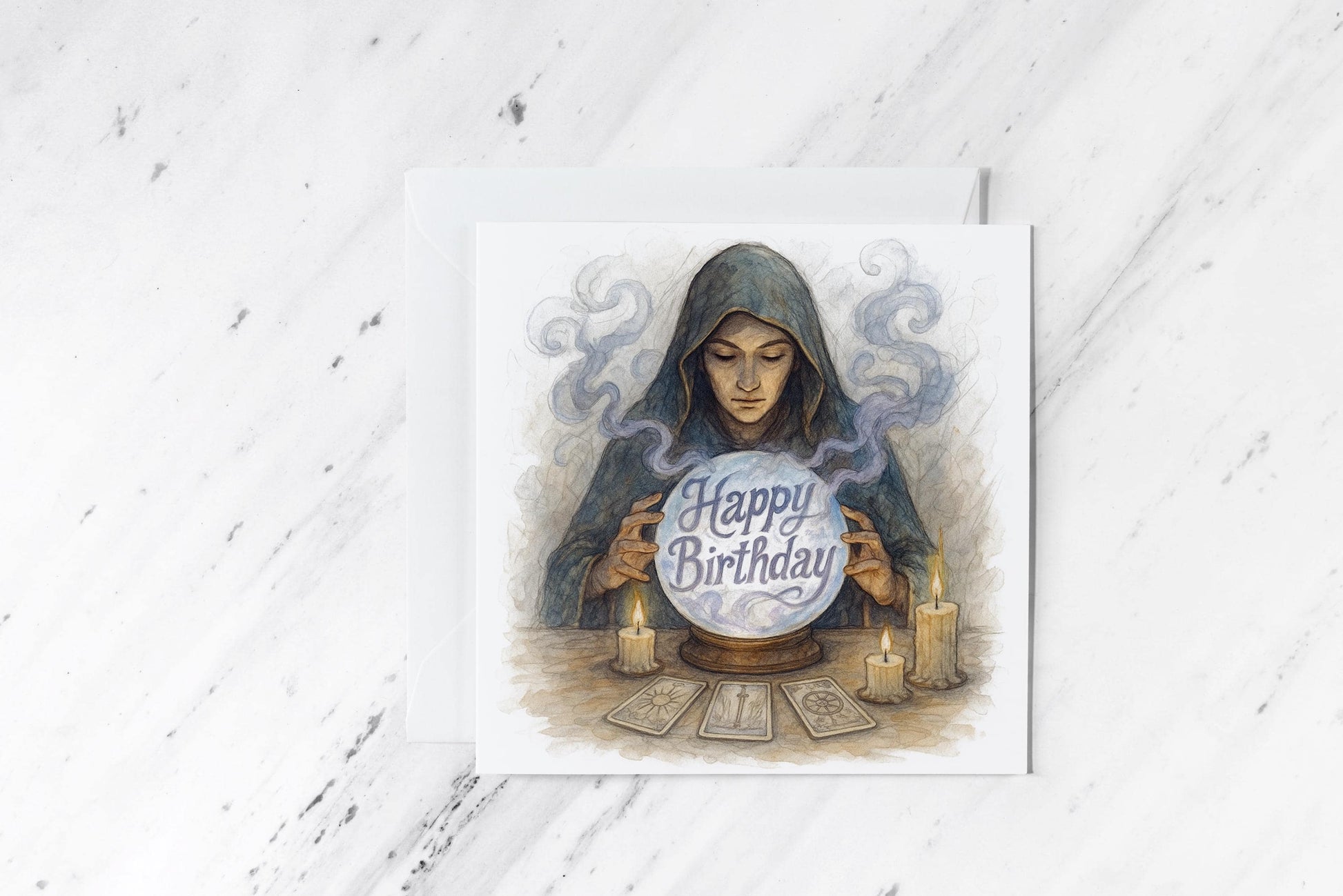 Mystical Crystal Ball Birthday Card – Tarot Reader Seer Illustration – Witchy Divination Greeting – Fortune Telling Handmade Card – Spiritual Gift Celebrate a special birthday with this uniquely artistic square card, featuring a delicate print of an original watercoloured pencil sketch. This enchanting design depicts a cloaked seer seated at a ritual table, gazing into a glowing crystal ball that reveals the words “Happy Birthday.” Surrounded by flickering candles and tarot cards, this atmospheric artwork invokes the magic of foresight, ritual, and inner power. Perfect for tarot readers, mystics, witches, or anyone who walks a spiritual path, this card is a magical way to mark another turn around the sun. Printed on luxurious 300 GSM premium cardstock, this occult birthday card is both a stunning keepsake and a heartfelt offering. Stylish, symbolic, and sustainable — it’s a powerful way to share light and mystery with someone you love 🌿. 🎨 Features an authentic print of a hand-drawn watercolour pencil sketch — capturing fine mystical detail and spiritual ambience 💌 Comes with a matching envelope, ready for gifting or mailing 📏 Size: 6x6 inches – the perfect square format for impact and elegance 🖨️ Printed on high-quality 300 GSM card stock for a luxurious, professional finish ♻️ Packaged in eco-friendly, recyclable Manilla Hard Board Backed Envelopes to ensure safe and sustainable delivery ✨ Blank inside for your heartfelt message – or opt to personalize it with a printed message of your choice 📮 Dispatched promptly via Royal Mail, ensuring a smooth and reliable delivery experience 🖐️ Hand-assembled with care and intention, perfect for lovers of divination, tarot art, and witchy stationery Let your birthday wishes be foretold with this captivating crystal ball card — a magical moment preserved in paper.