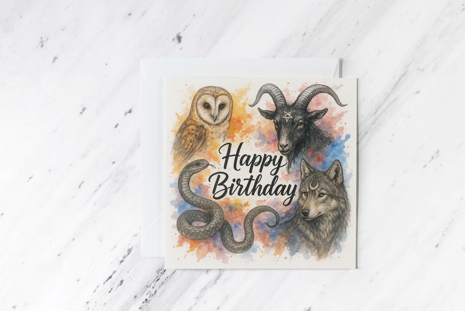 Occult Animal Birthday Card – Witchy Card with Owl, Goat, Snake & Wolf – Watercolour Art – Pagan Gothic Greeting – Handmade and Eco-Friendly
