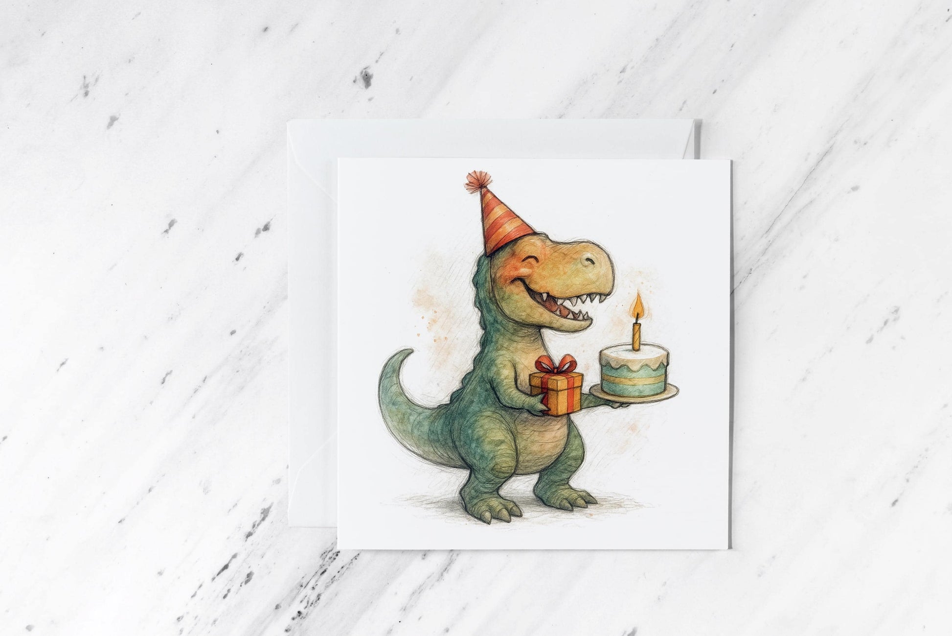 T-Rex Birthday Card – Funny Dinosaur Greeting with Cake and Present – Watercolour Jurassic Party Card for Kids and Adults Stomp into the party with this adorable T-Rex birthday card featuring a joyful dino in a party hat, holding a cake and present! With its charming watercolour and pencil sketch style, this card is perfect for dino lovers of all ages. Whether you're celebrating a little one’s big day or surprising a Jurassic Park fan with a prehistoric giggle, this cheeky dinosaur design is guaranteed to be a roaring success. 🎨 Printed from an original watercolour and pencil sketch 💌 Includes white envelope – ready to post or gift 📏 6x6 inch square card – bold and full of character 🖨️ Premium 300 GSM matte cardstock – smooth and high-quality ♻️ Eco-conscious packaging – sent plastic-free in a recyclable envelope ✨ Blank inside for your personal message or optional custom printing 📮 Shipped via Royal Mail from the UK 🖐️ Handmade and designed by The Occult Print Shop A perfect card for birthdays, parties, and anyone who believes dinos never go out of style!