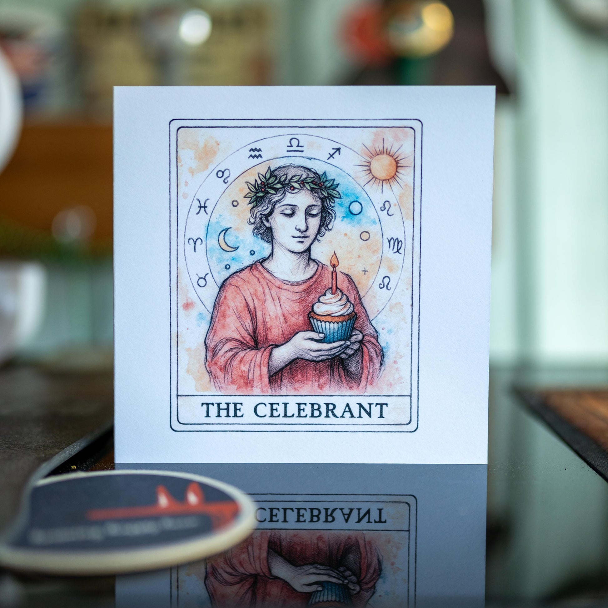 Celebrate a special birthday with this uniquely artistic square card, featuring a delicate print of an original watercoloured pencil sketch. Styled like a vintage tarot card, this design presents “The Celebrant” — a celestial figure crowned in greenery, holding a single cupcake with a lit candle, surrounded by a glowing zodiac wheel.